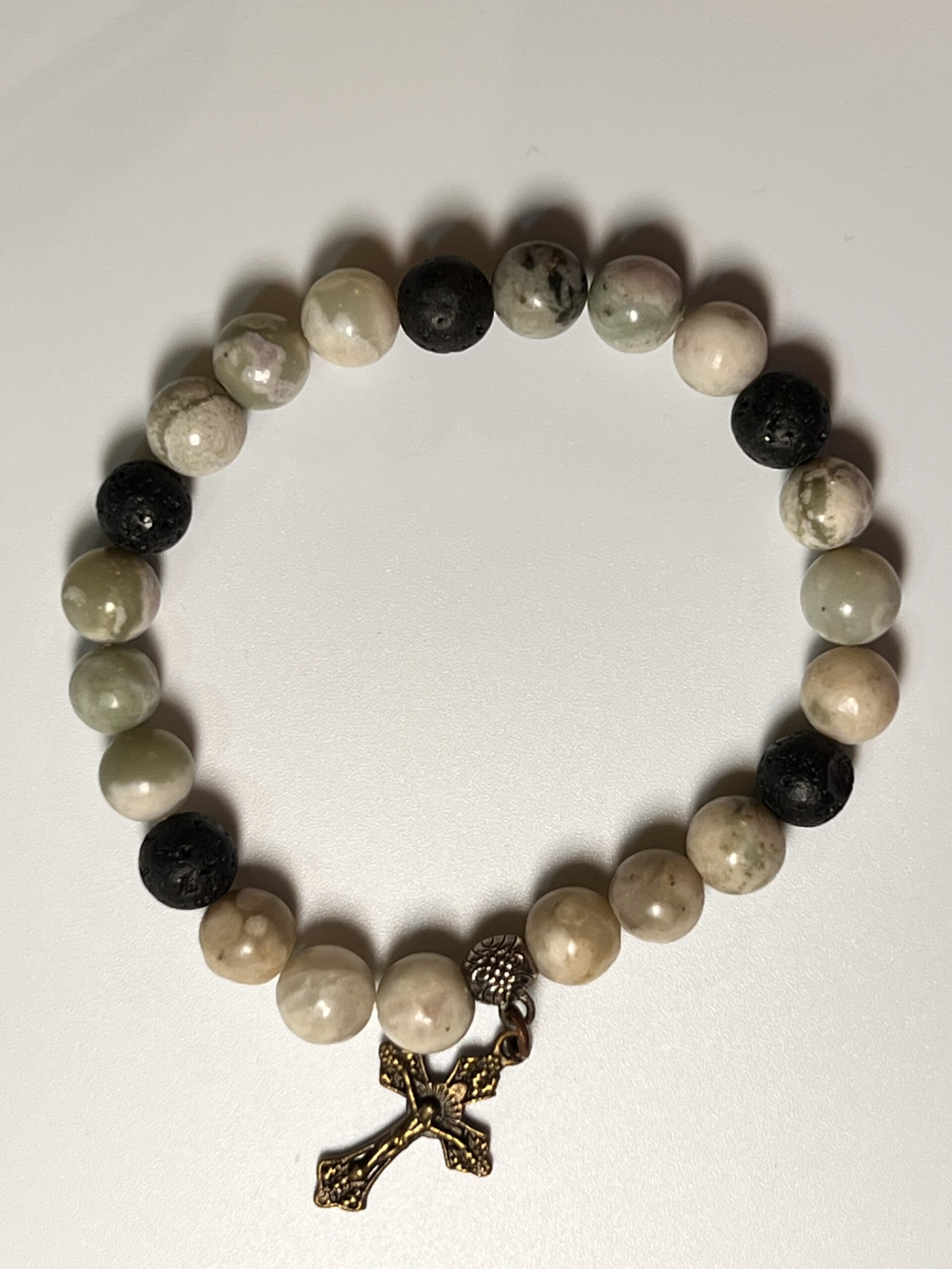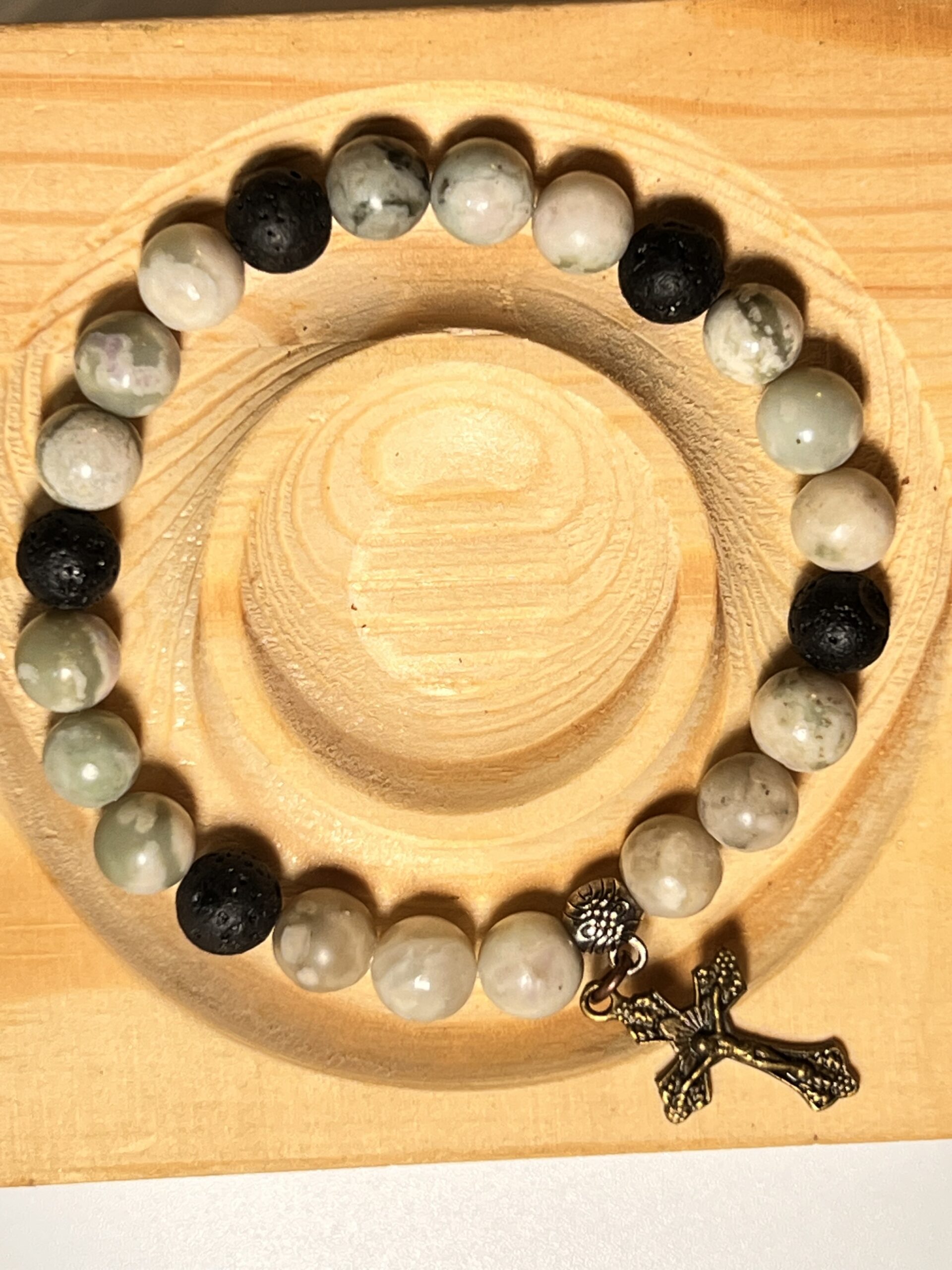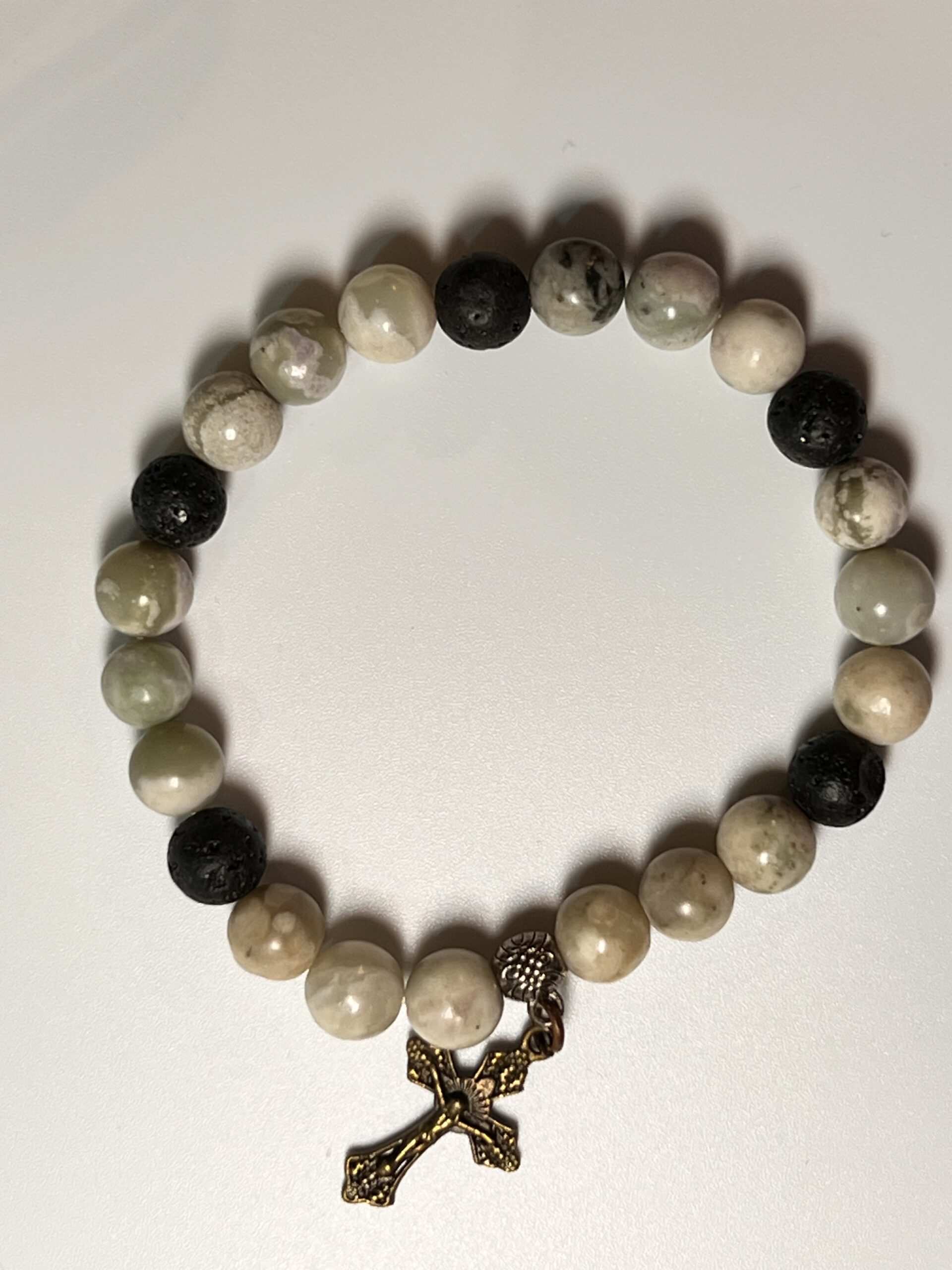 Lovely stretchy bracelet with small crucifix . The beads are Jade intermingled with lava stone beads .