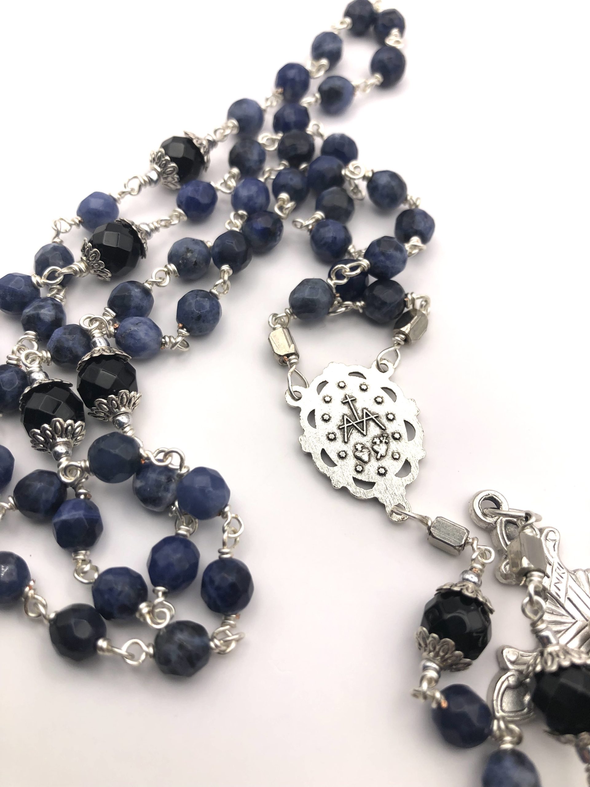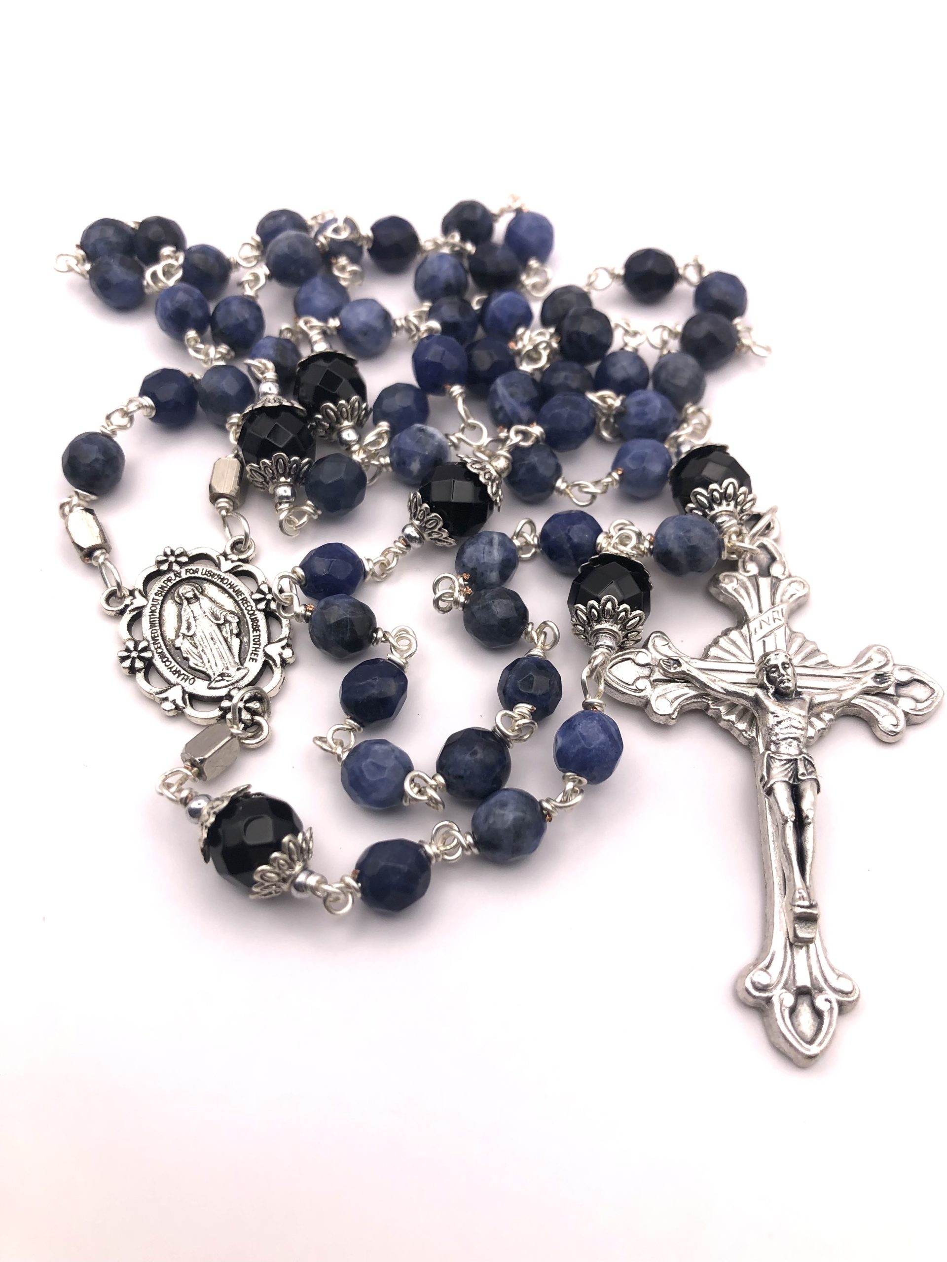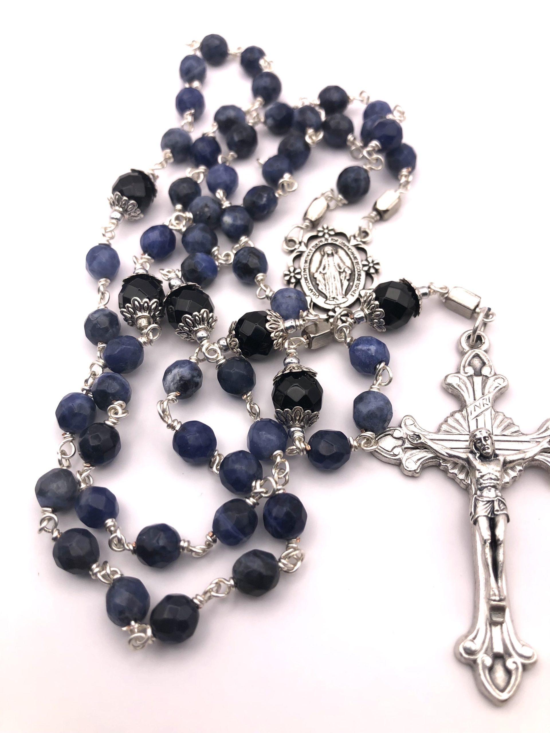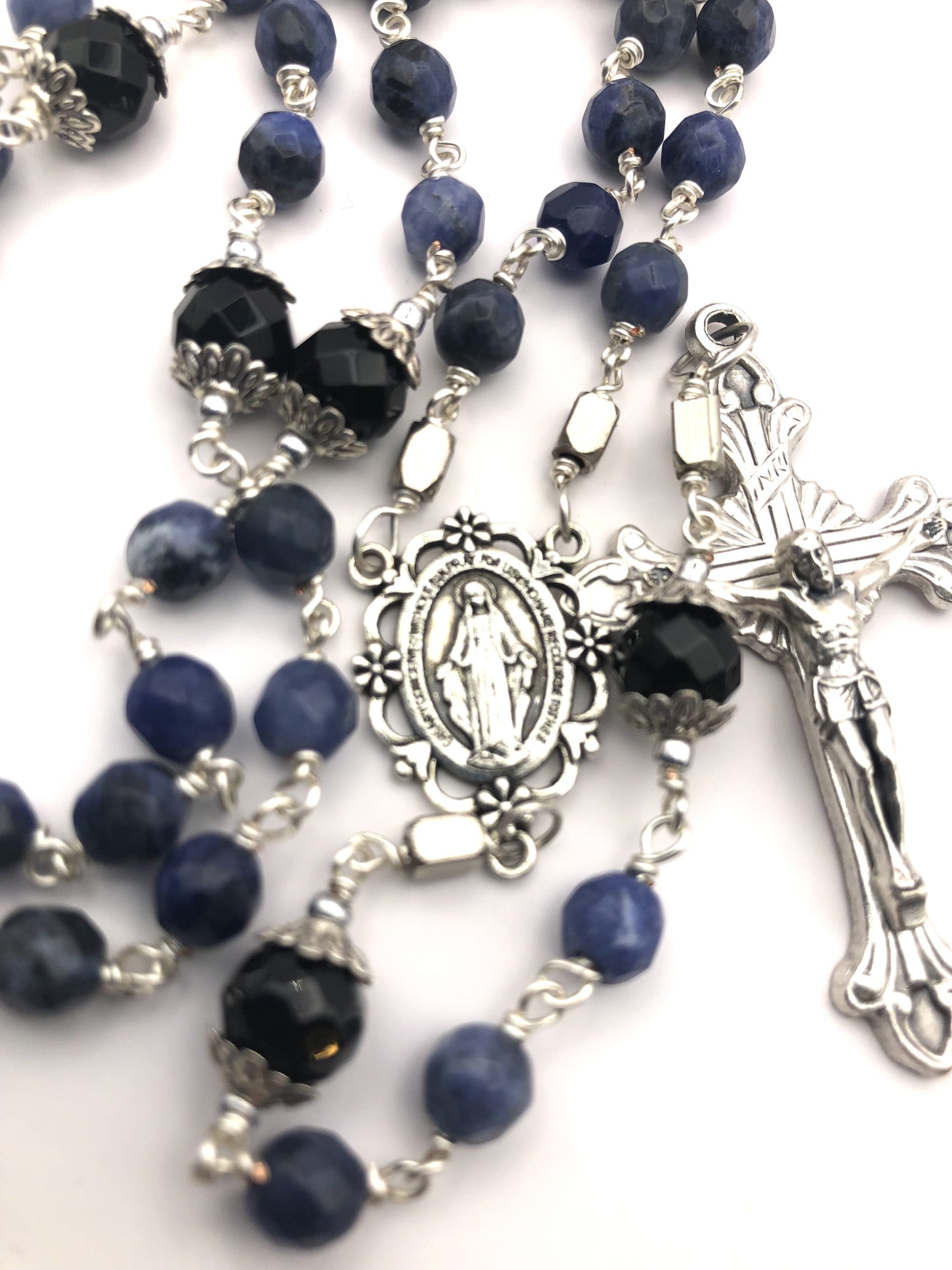 This beautiful rosary is made with high grade faceted sodalite beads. It is simply stunning against the silver wire.