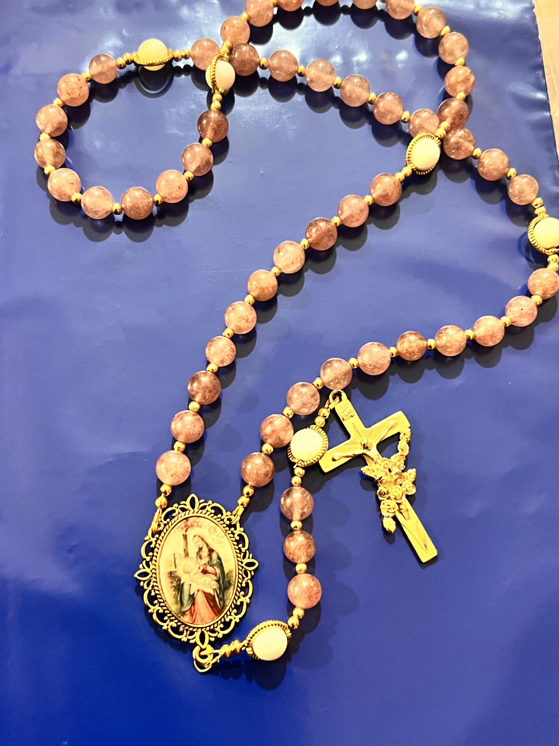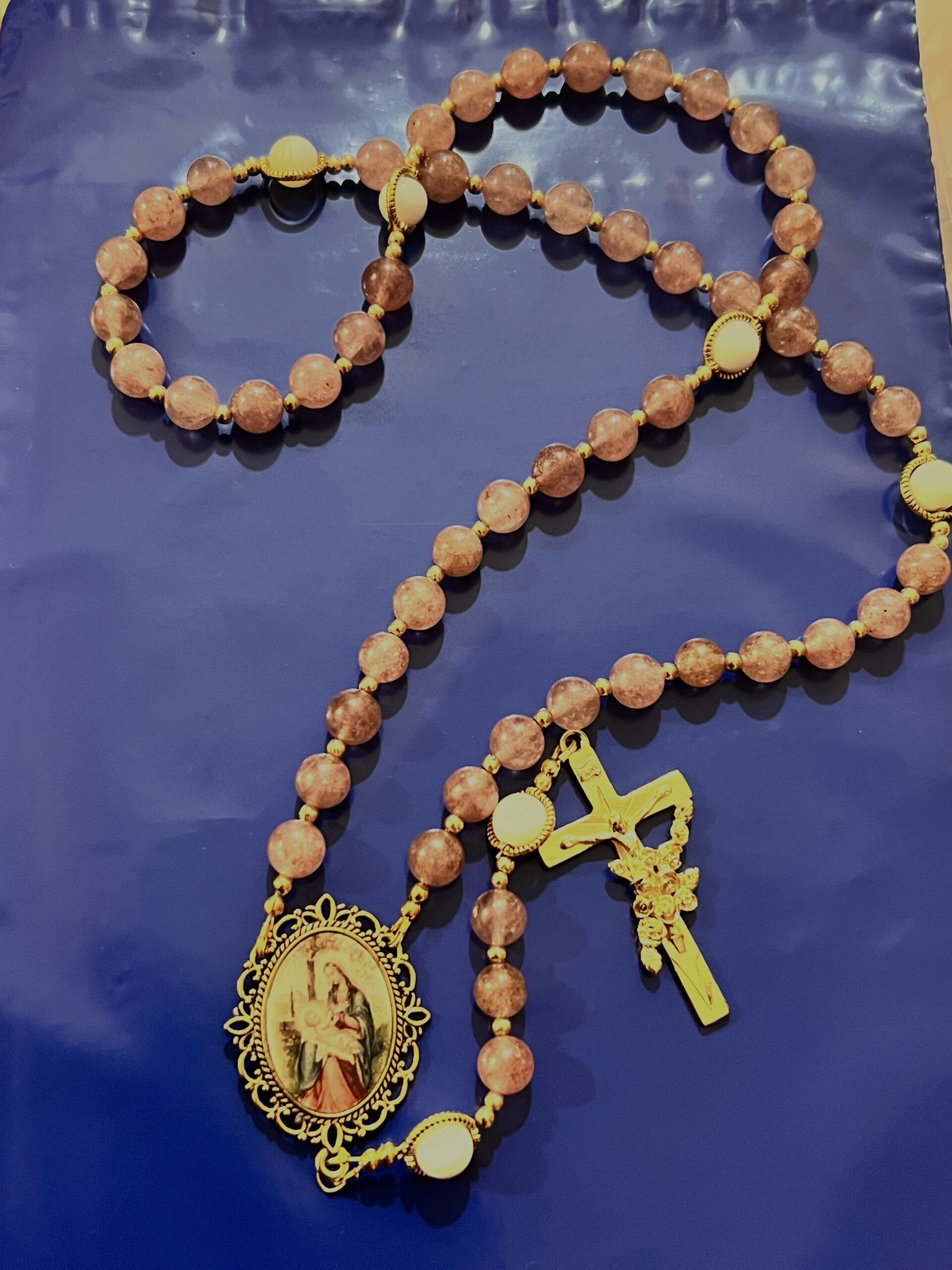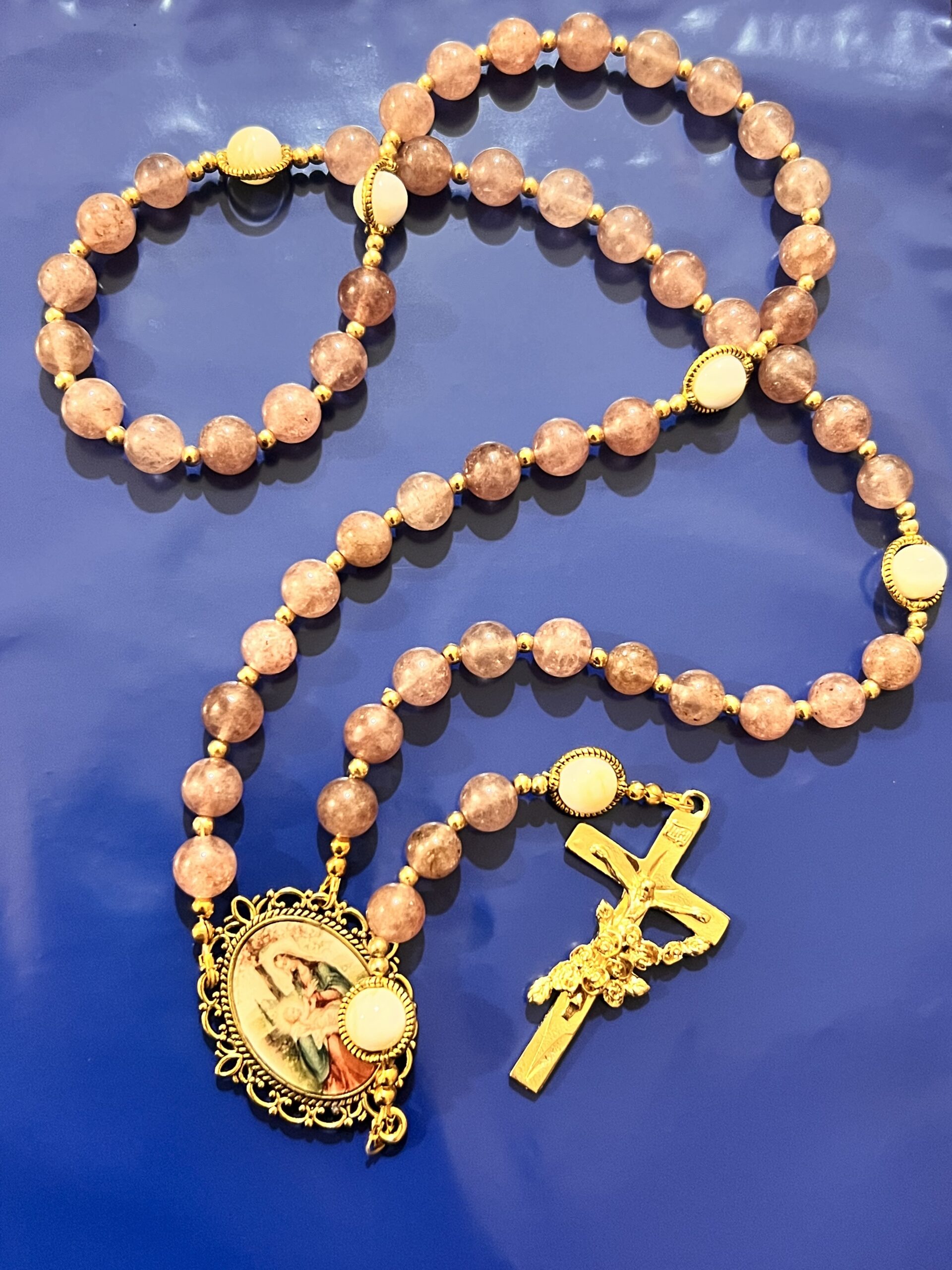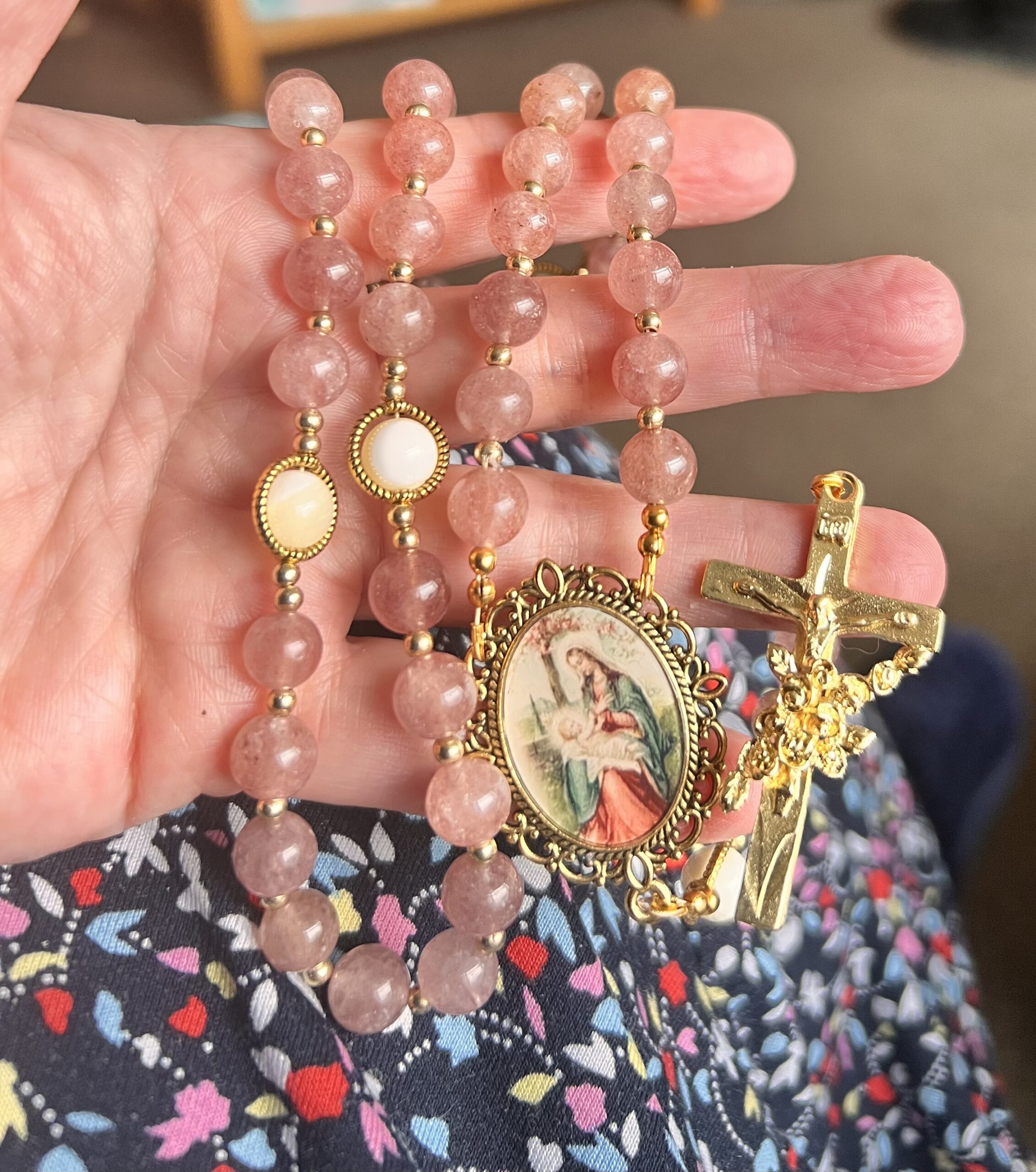 This stunning rosary is made from Strawberry Quartz and Mother of Pearl beads with good colour parts that set the beads off beautifully.