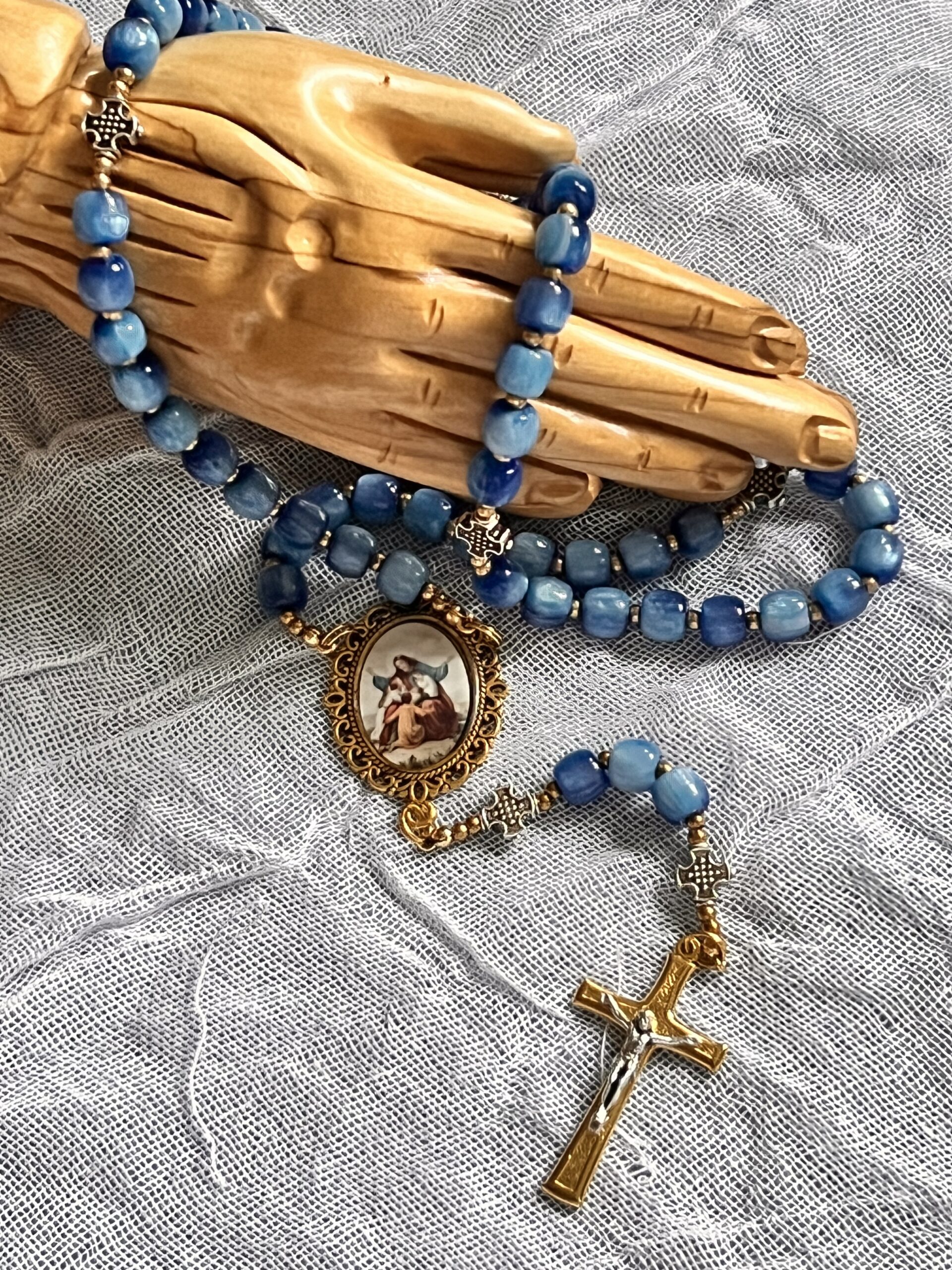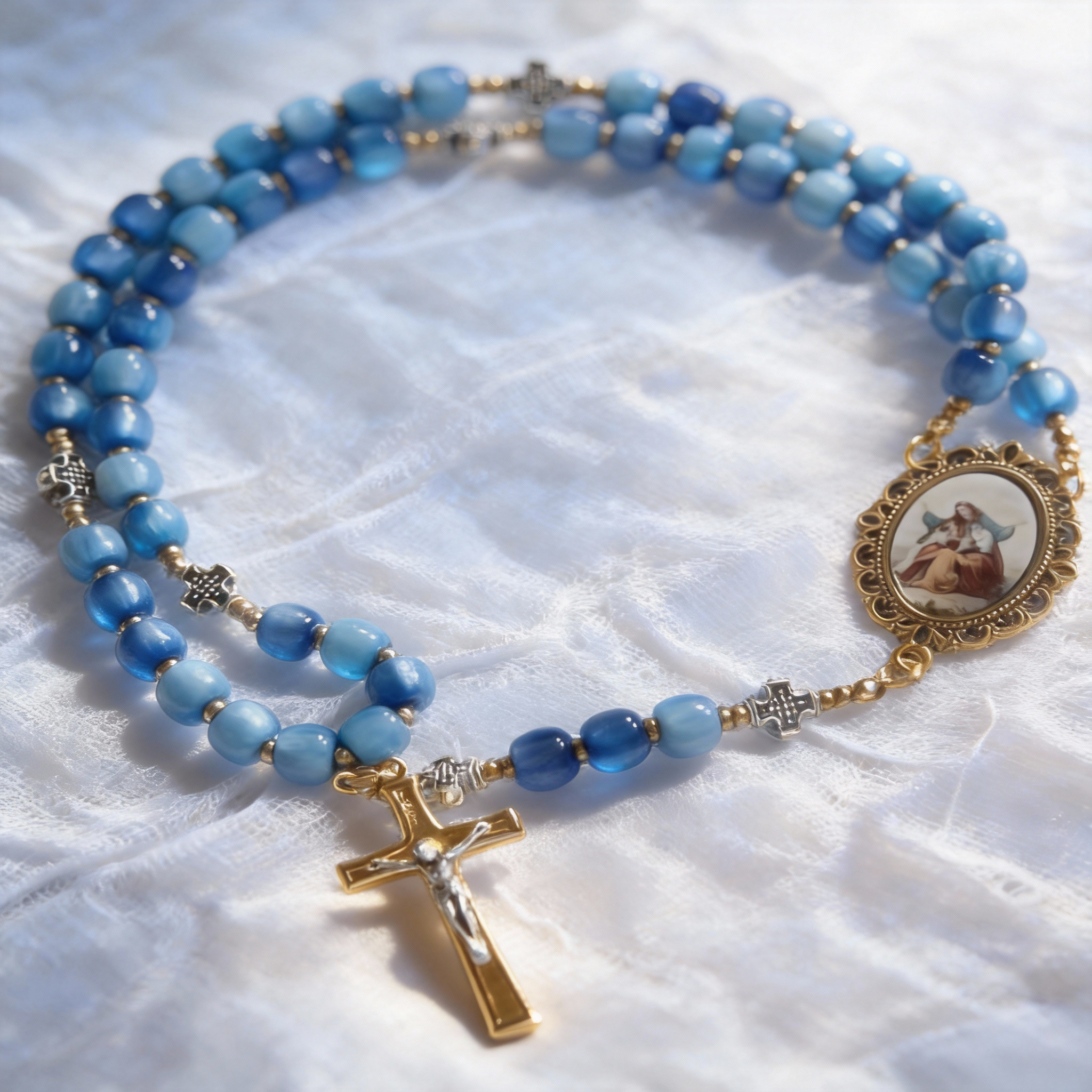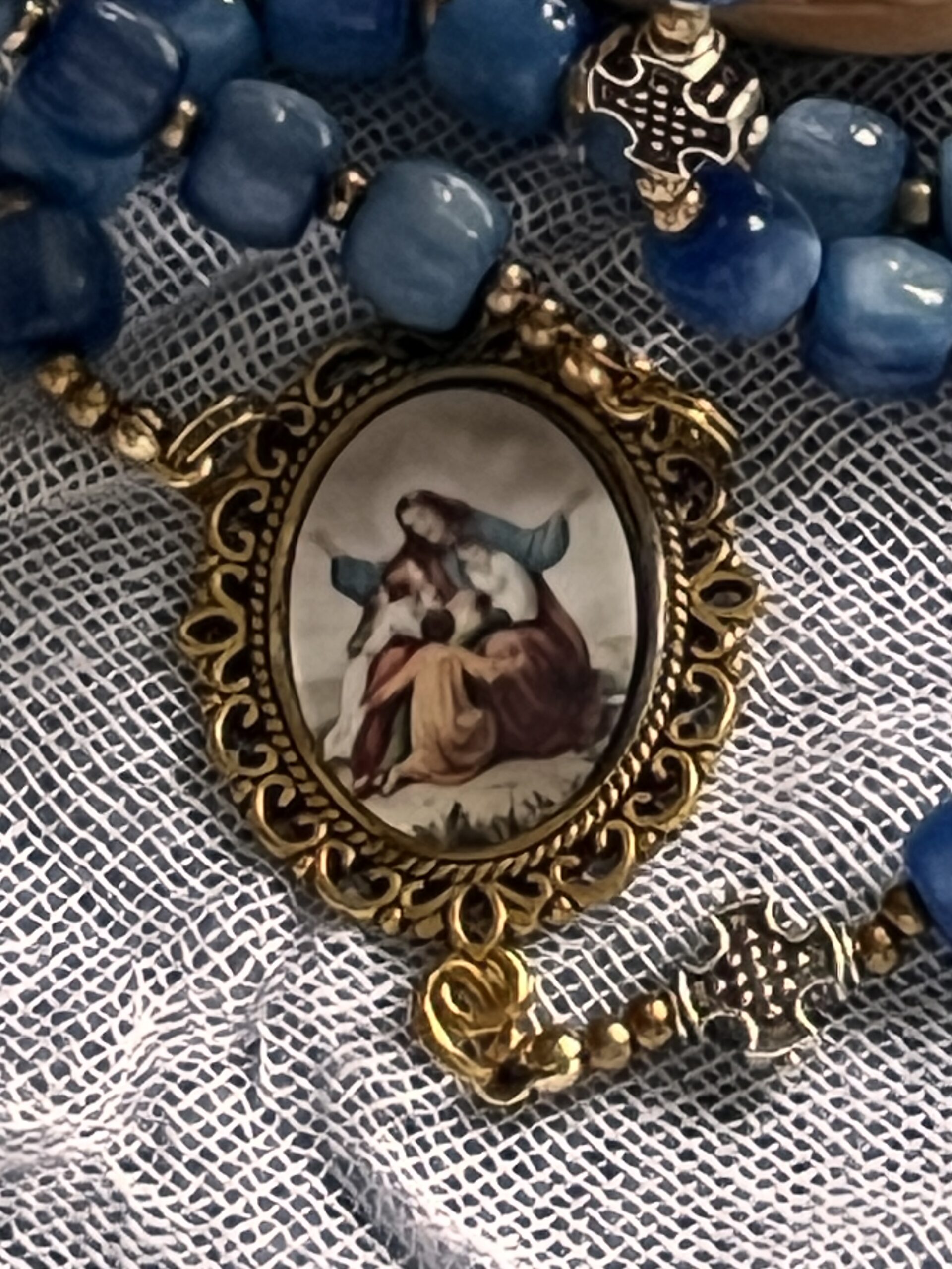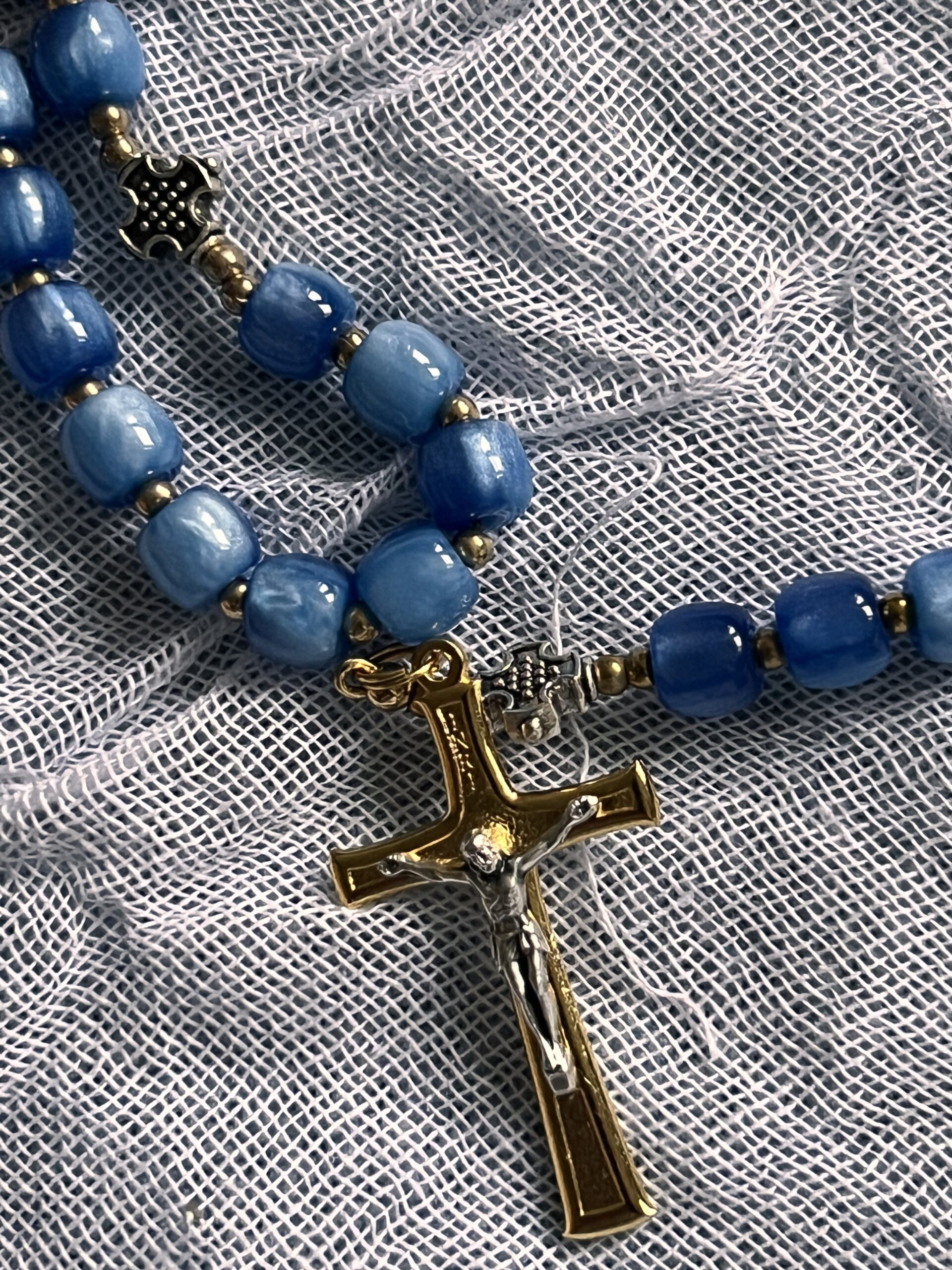 the rosary has a beautiful sky blue hue with a slight sparkle . The Pater cross beads  add to the overall sparkle of the look.