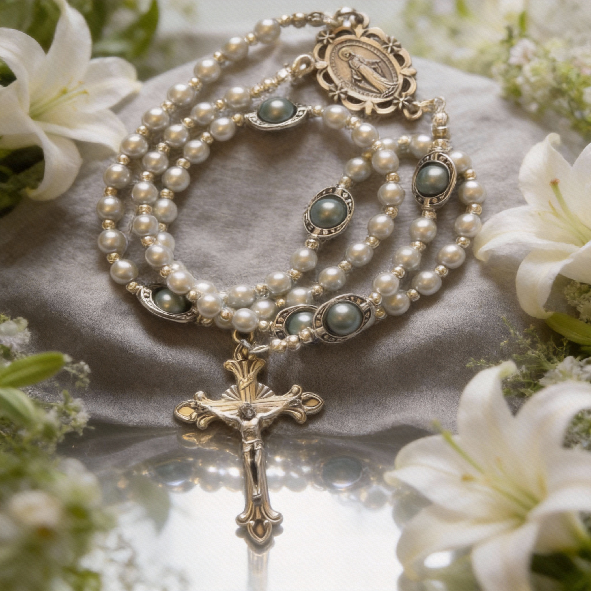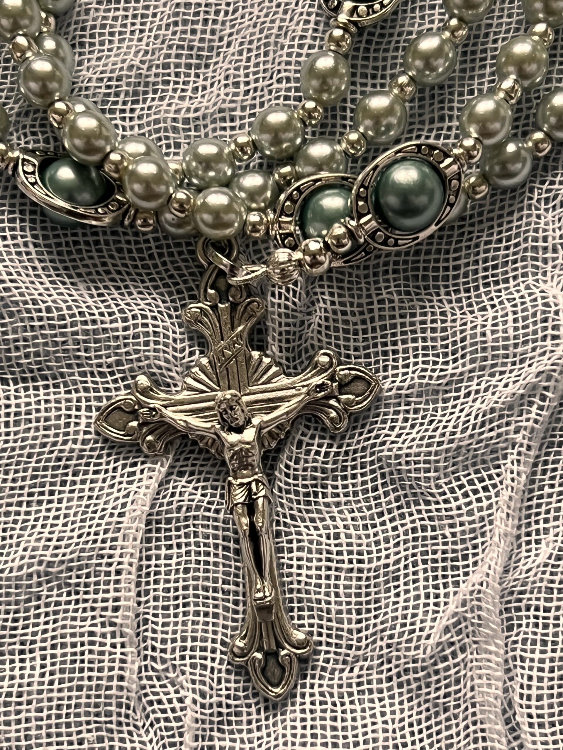 This rosary in pale blue/teal and silver tones is a real beauty! The larger Our Father beads are framed with such elegance , they really stand out.