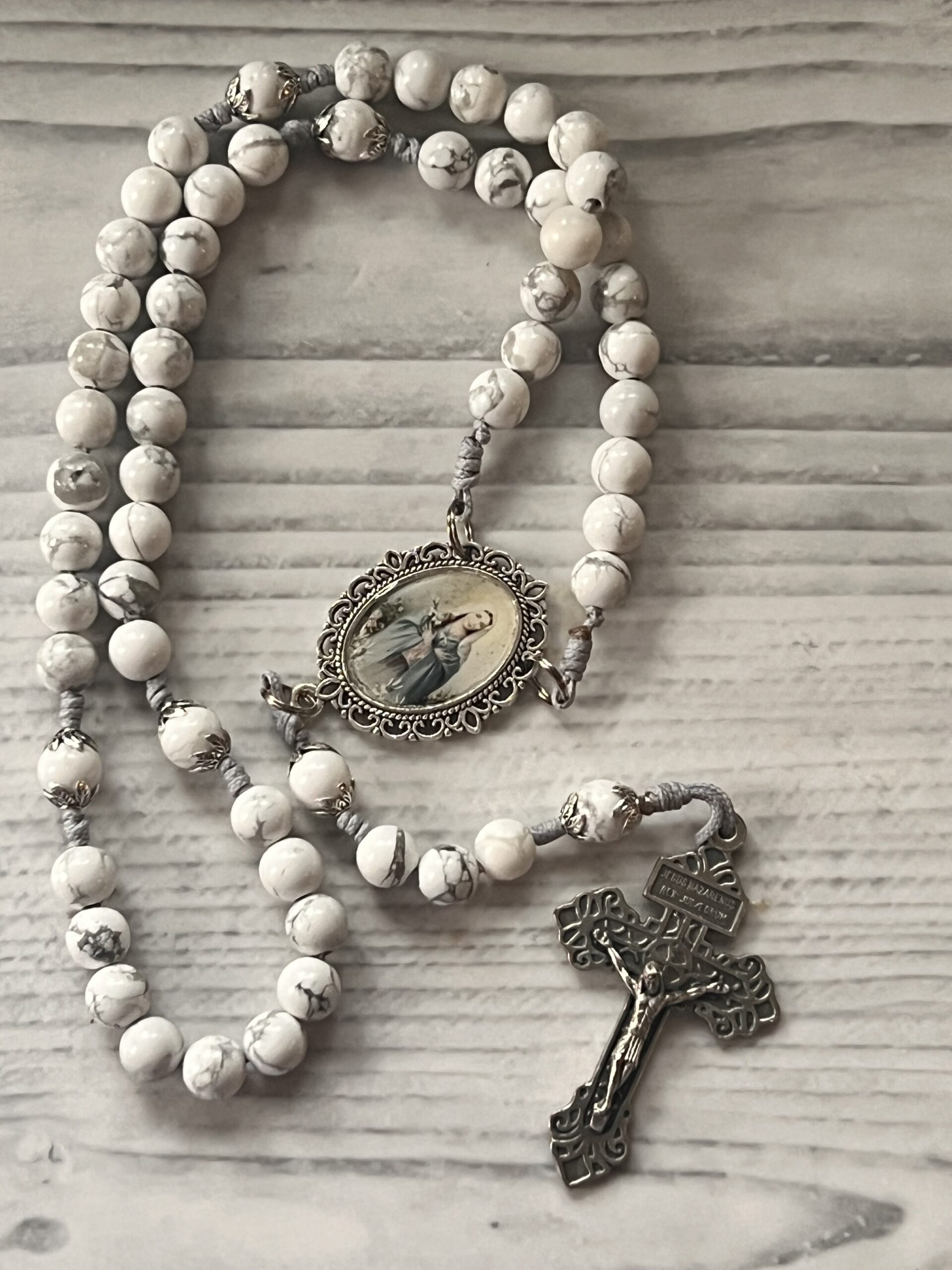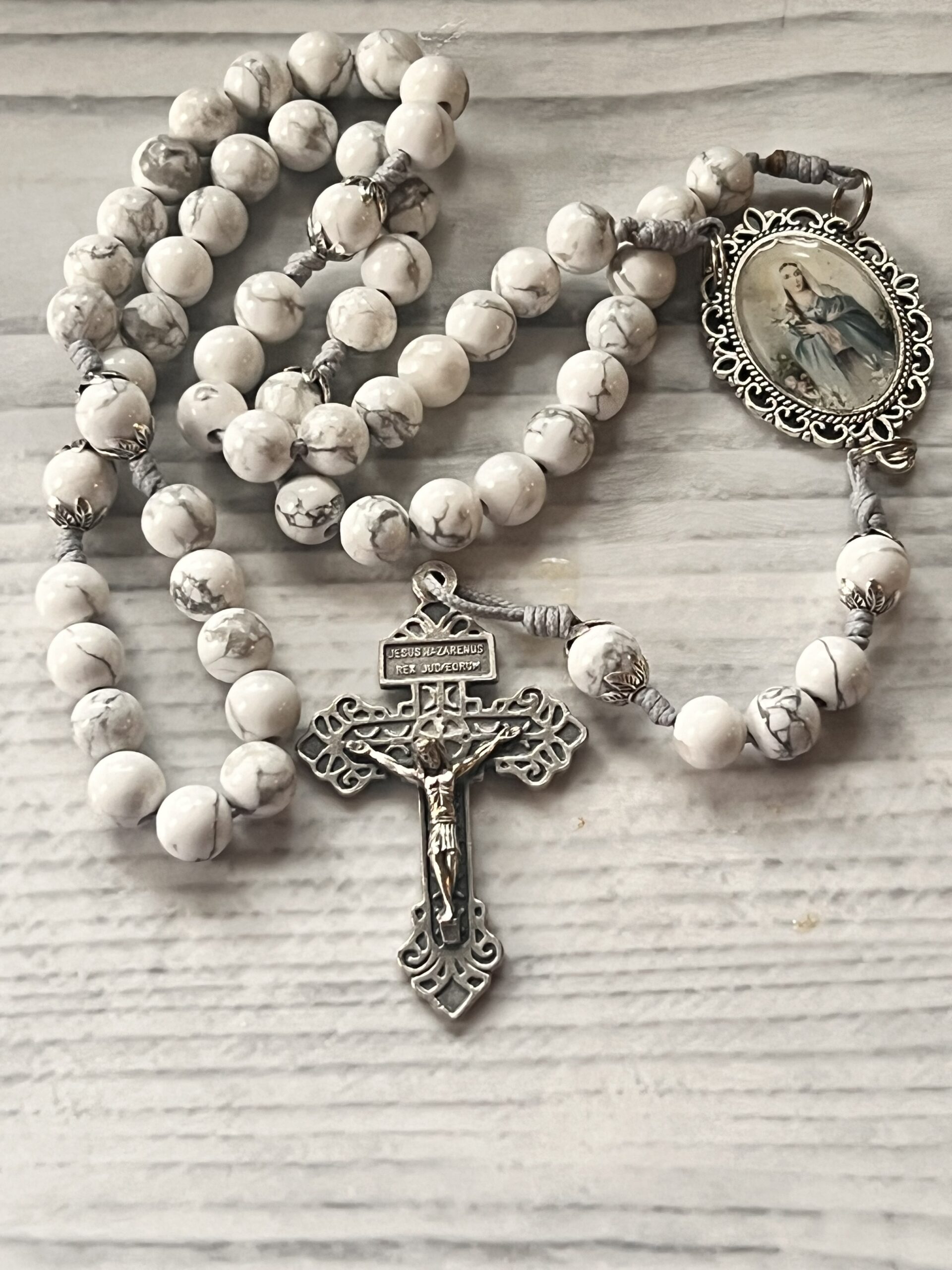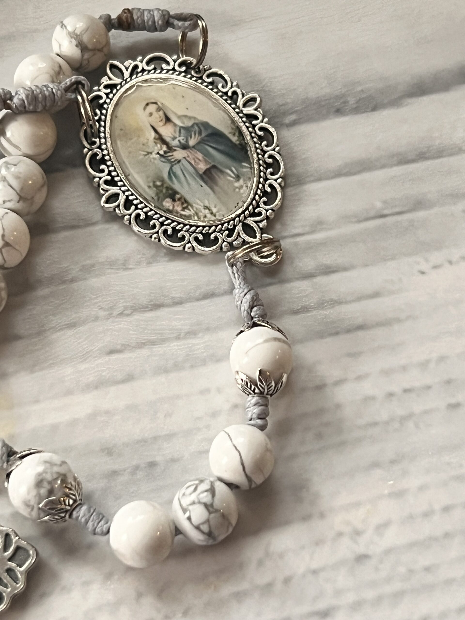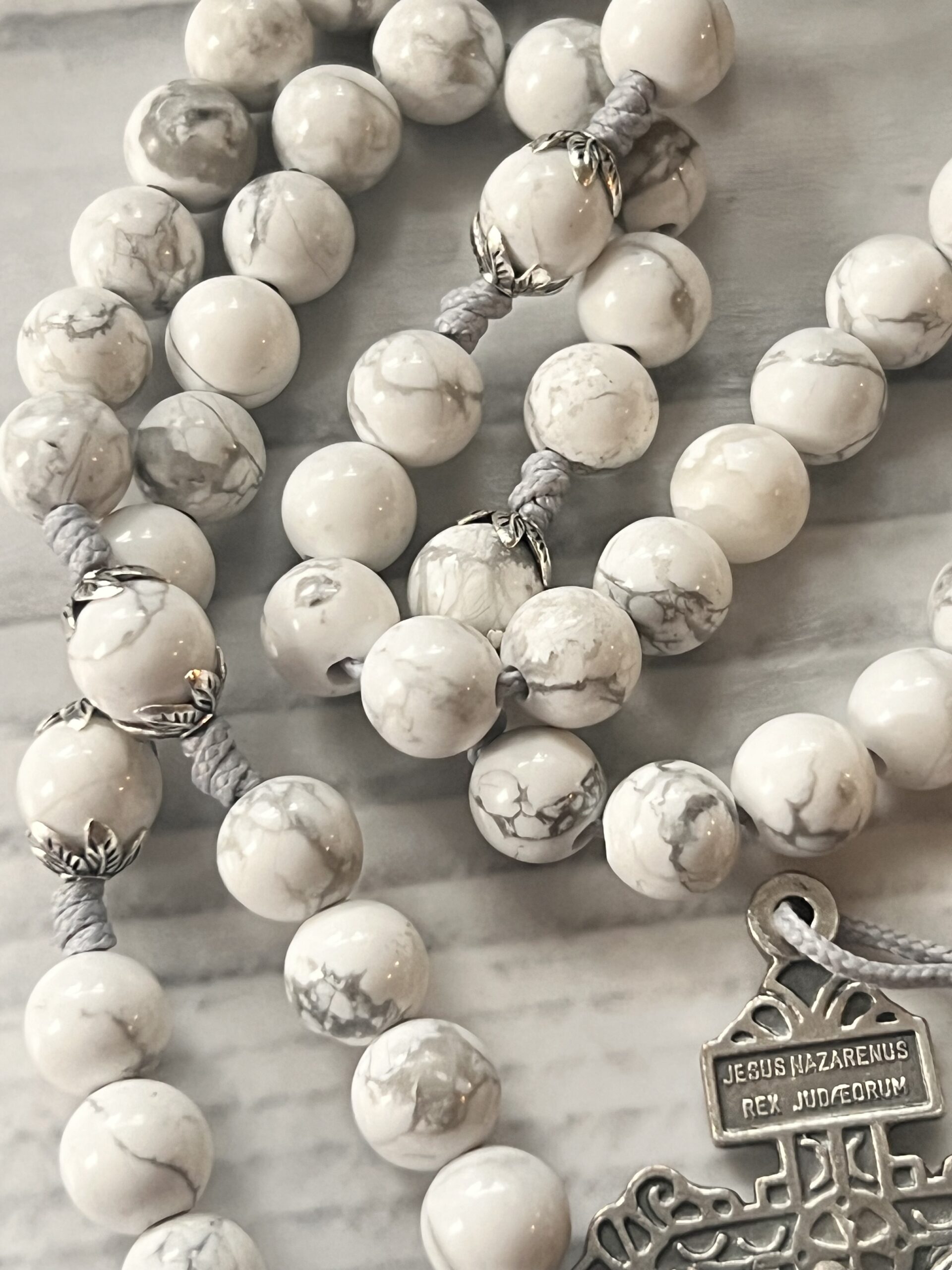 This gorgeous rosary uses white howlite beads and thin grey paracord.