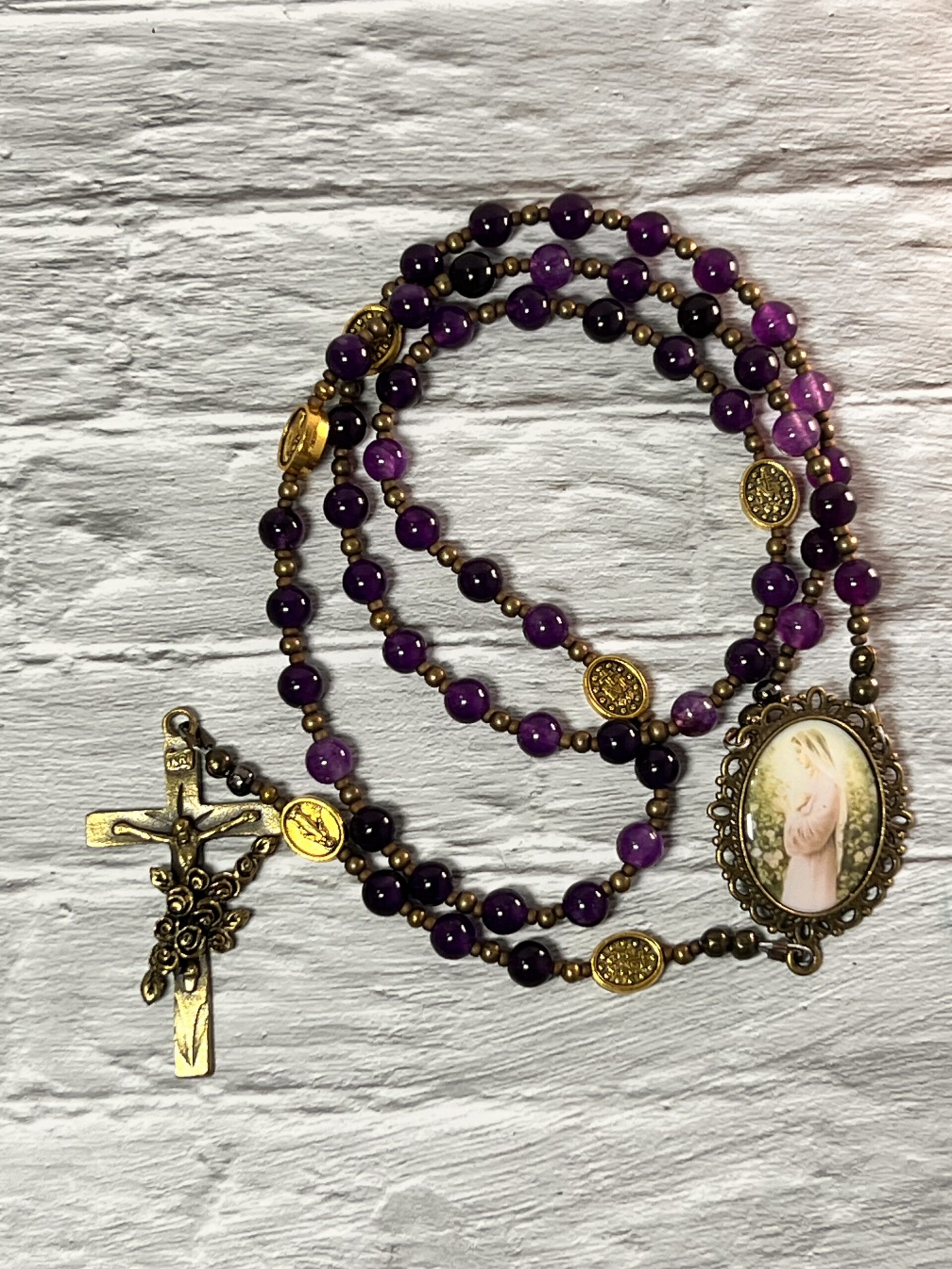 This stunning rosary is made with amethyst beads and bronze tones. The handmade resin centrepiece uses a vintage image of our Lady walking in a garden in prayer.