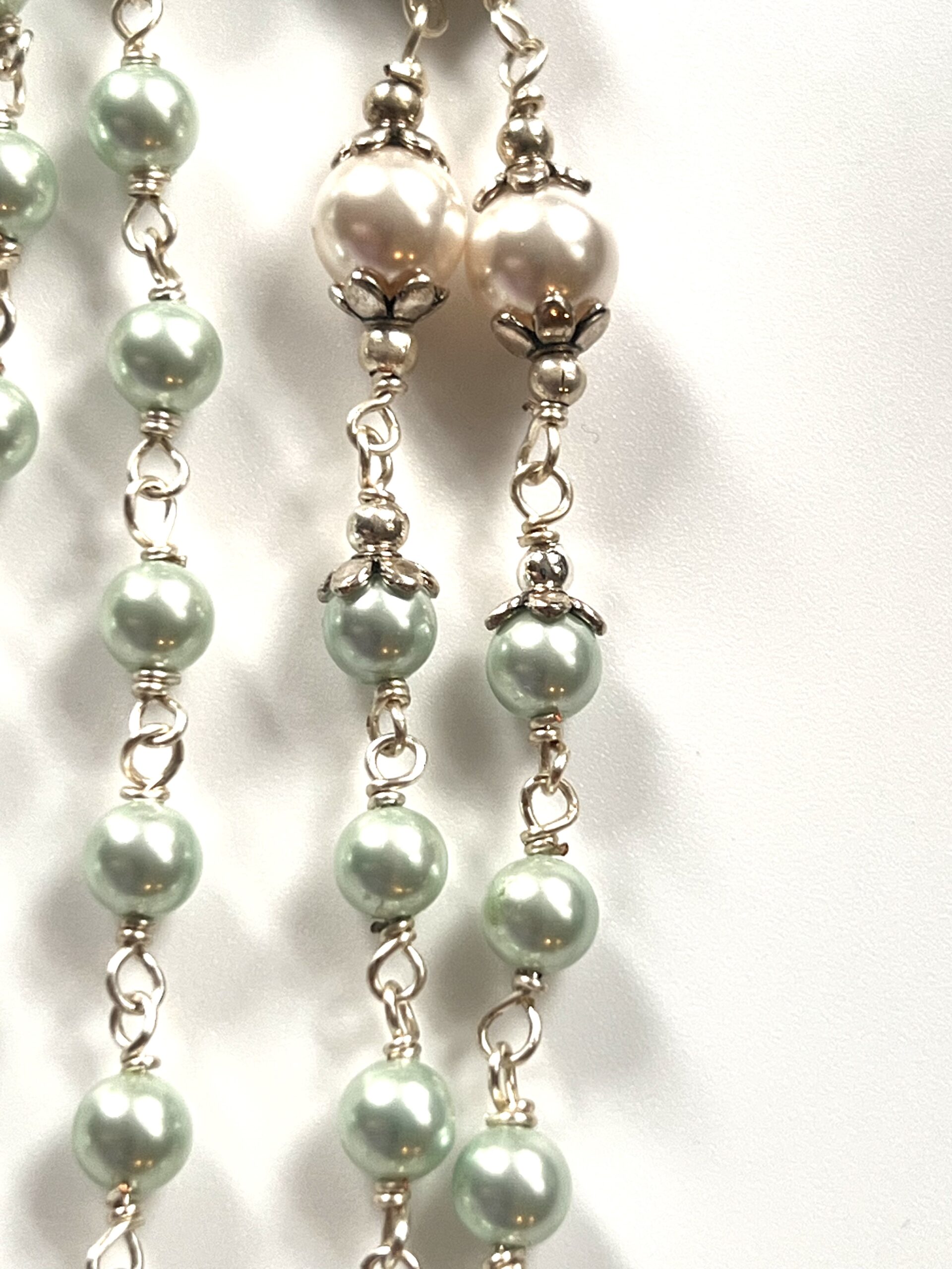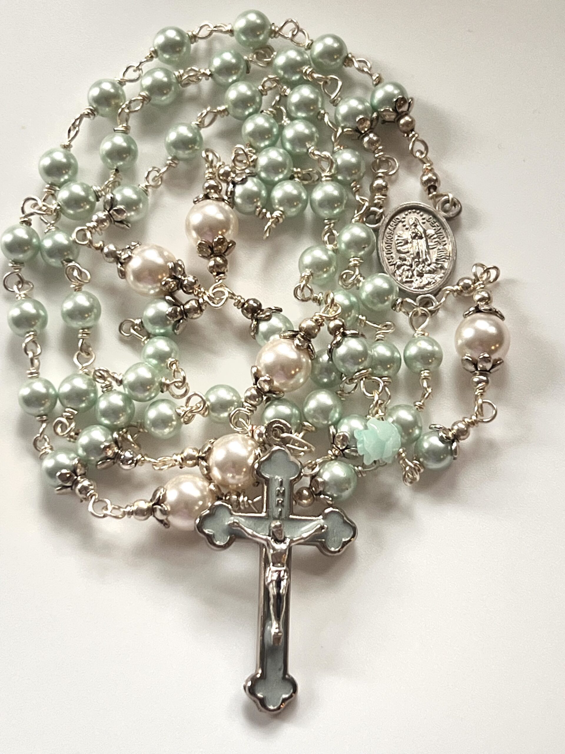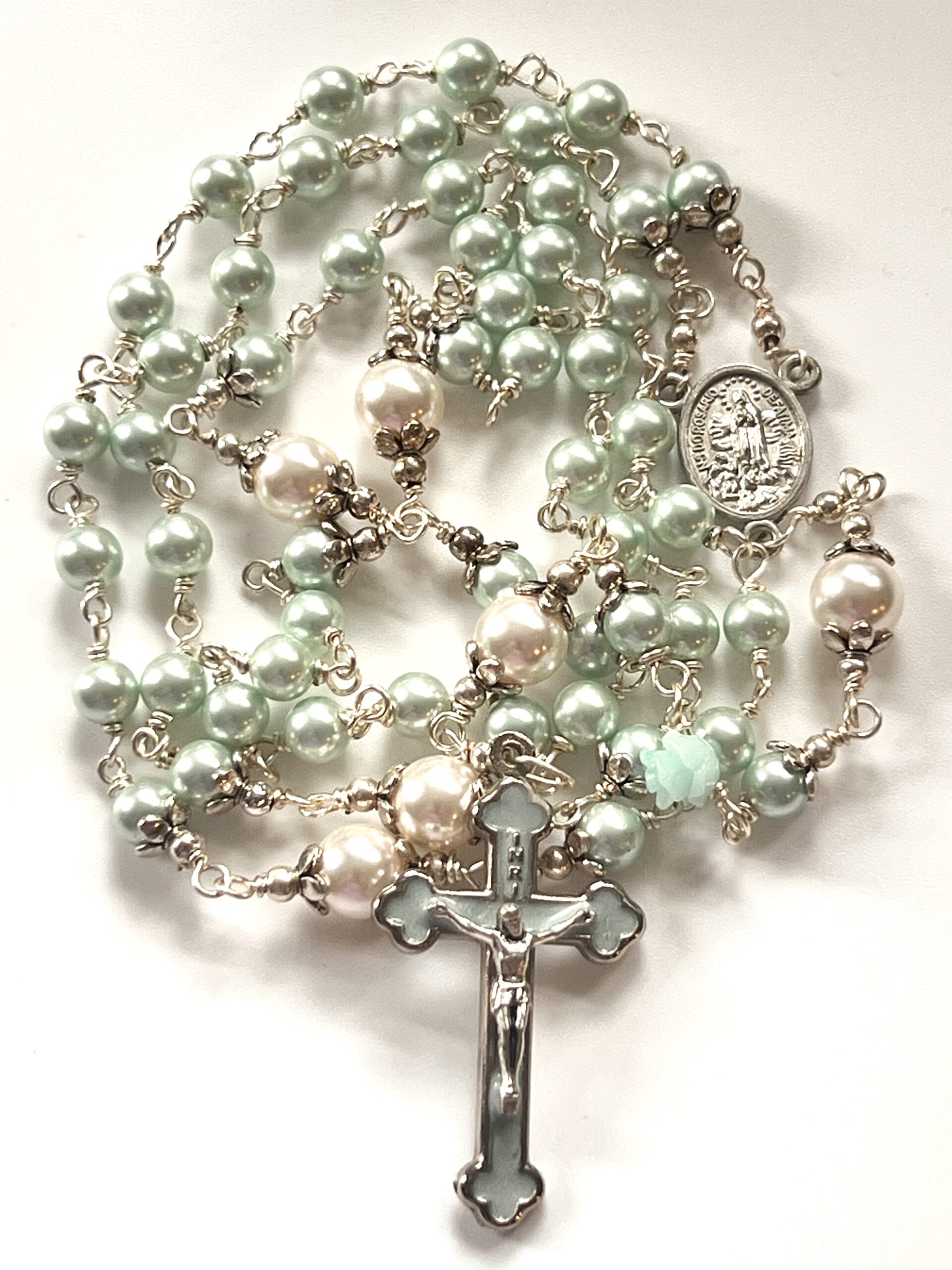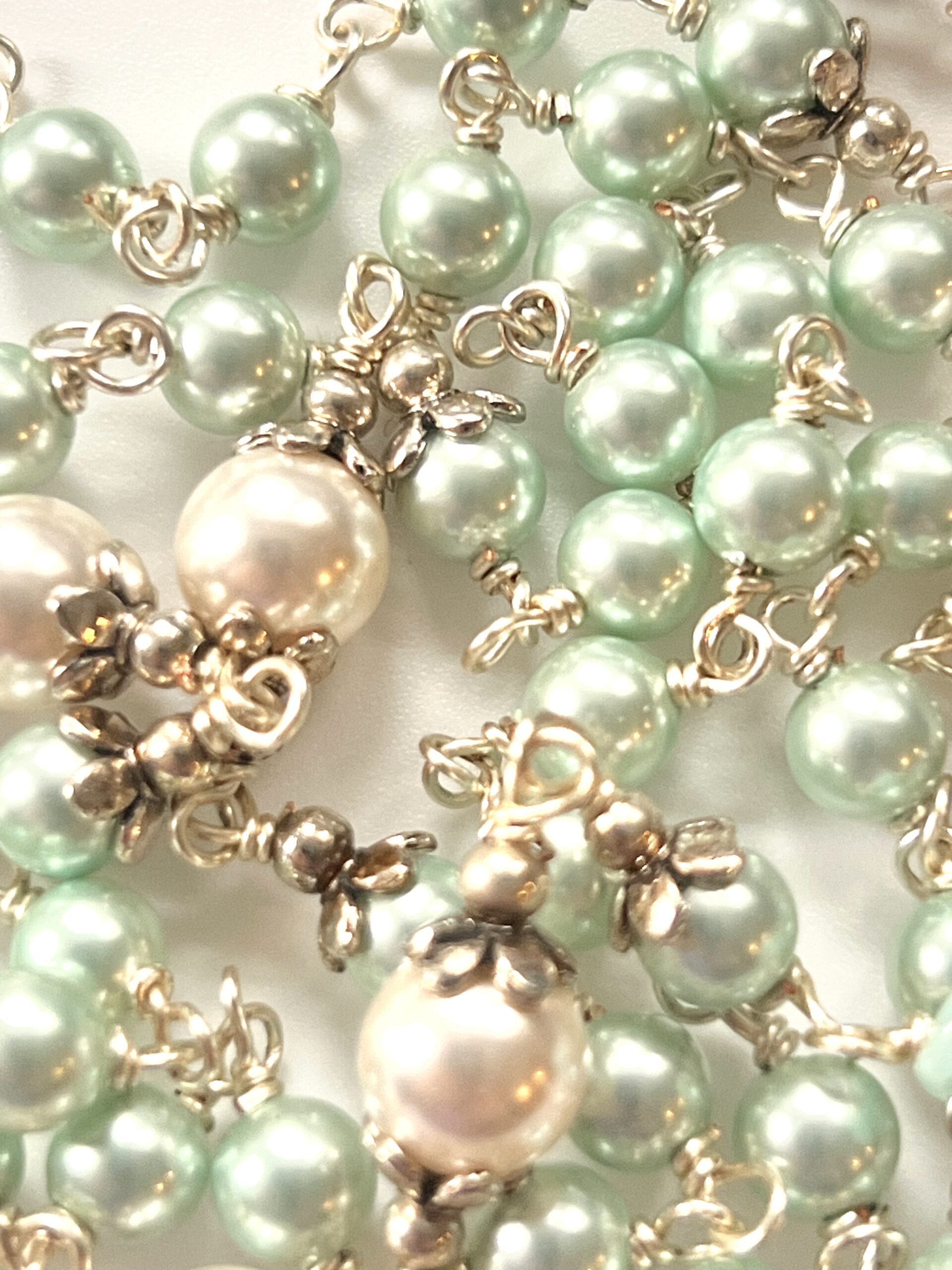 No hi This rosary is so pretty ! Really breathtaking. The Ave beads are a good quality glass pearl as are the Paters which are the serenity pearl brand closely associated with Swarovski. The rosary is wire wrapped making it very strong – impossible for the links to come apart. With careful , prayerful use there is no reason why this shouldn’t last for years. A true heirloom!