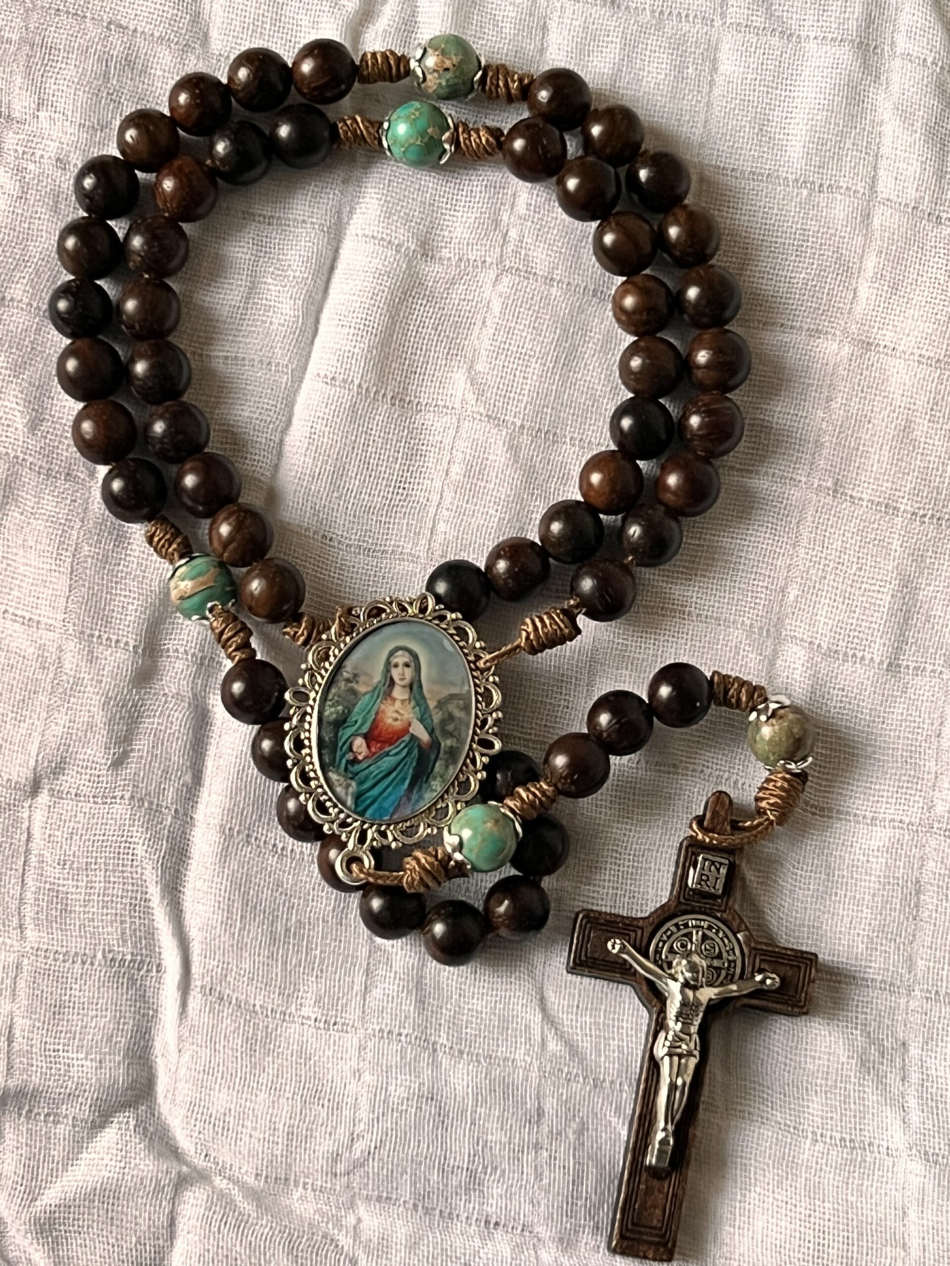 I love this simple yet utterly beautiful rosary made with dark wood beads and a handmade centrepiece featuring the art of Adam Dzubia a very talented Polish artist. The Our Father beads are a Jasper stone with beautiful blue and green hues.